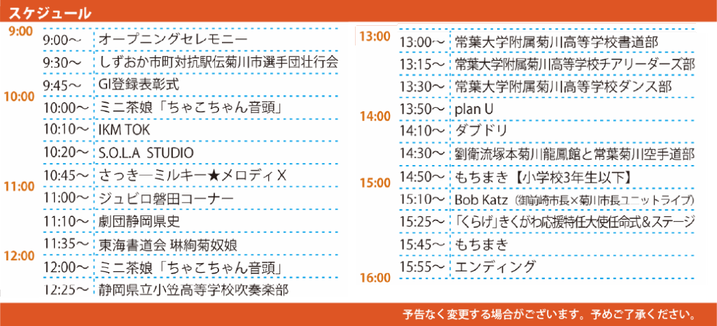 問い合わせ:0537-36-0201(菊川市観光協会 平日8:30-17:15)