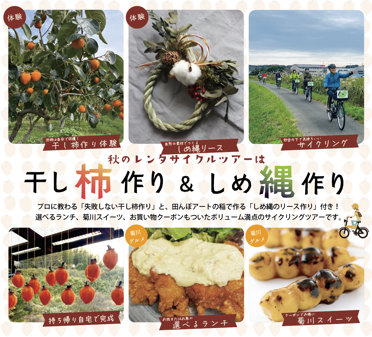 電動アシスト自転車でサイクリングしながら、干し柿作りの達人の柿農園へ、「失敗しない干し柿作り」を教えていただきます。ランチの後は自然素材で作る「しめ縄リース作り」と、駅周辺の老舗菊川スイーツのお店を回りながらお買い物を楽しんでいただくボリューム満点ツアーです。