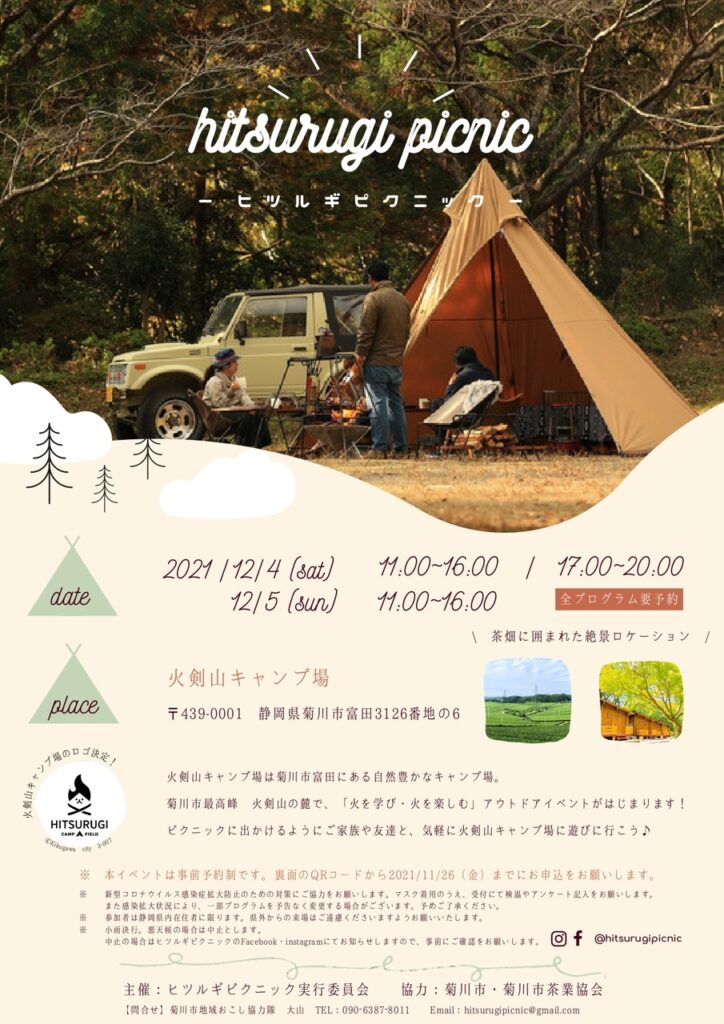 hitsurugi picnic ~ヒツルギ ピクニック~ 12月4日(土)11:00~16:00、17::00~20:00 5日(日)11:00~16:00 9プロブラム開催(全プログラム要予約) 締切11/26(金) 問合せ 菊川市地域おこし協力隊 大山 090-6387-8011 email: hitsurug... -